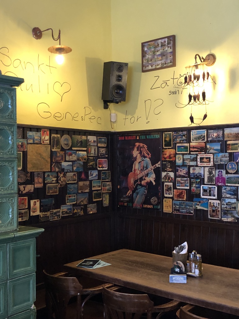 There’s plenty of sartorial diversity on view at the Bulldog. The same goes for the diversity of visual stimuli. Postcards are pinned to the wood paneling, sharing space with a poster of Bob Marley. An oar hangs on one of the walls, football team pennants line the bulkhead, skis hang from the ceiling. In a twist, the graffiti usually reserved for the WC has migrated to the yellow walls topping the wood paneling, with scrawled lines condemning Putin and racism or pledging support for sports teams like St. Pauli. I order another Urquell tankovný and become part of the pageant.